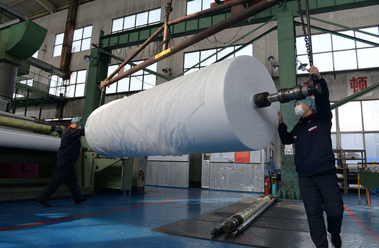 在山东俊富无纺布有限公司的生产车间,工人正在加工口罩用无纺布。(通联照片,受访企业提供)