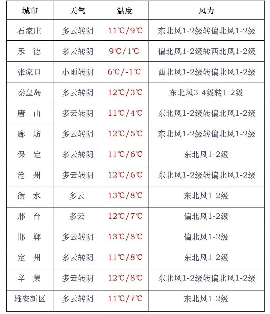 河北省气象台继续发布寒潮蓝色预警信号。受冷空气影响,预计18日,张家口中南部、承德、保定西北部最低气温下降9~12℃,局地下降14℃以上,其他大部分地区下降5~8℃。18-19日早晨,保定、廊坊以北地区有霜冻,最低气温降至-5~4℃,其中张家口北部、承德北部降至-10~-6℃,其他地区降至5~9℃,请注意防范。今天白天,张家口中南部、保定西北部、石家庄西北部山区多云转阴有雨夹雪或零星小雨,其他地区晴转多云。