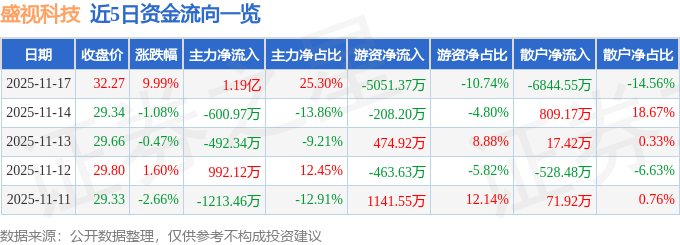2025-11-18今日股市,股票推荐,大盘走势分析,股市资讯,股票入门,短线炒股/为广大股民提供及时准确的股市行情分析、热点股票推荐、最新利好政策解读与炒股实战经验,帮助你把握投资先机、实现财富增长!证券之星消息,盛视科技11月17日涨停收盘,收盘价32.27元。该股于14点47分涨停,2次打开涨停,截止收盘封单资金为985.21万元,占其流通市值0.23%。