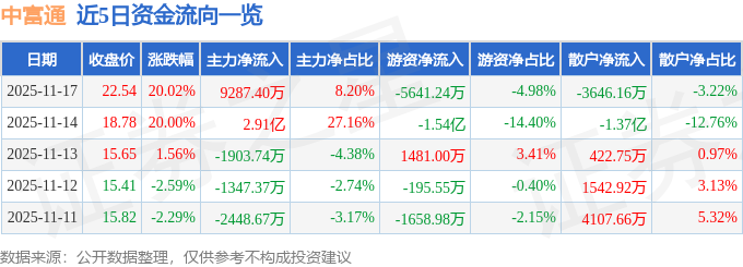 2025-11-18今日股市,股票推荐,大盘走势分析,股市资讯,股票入门,短线炒股/为广大股民提供及时准确的股市行情分析、热点股票推荐、最新利好政策解读与炒股实战经验,帮助你把握投资先机、实现财富增长!证券之星消息,中富通11月17日涨停收盘,收盘价22.54元。该股于9点25分涨停,3次打开涨停,截止收盘封单资金为1.25亿元,占其流通市值2.97%。