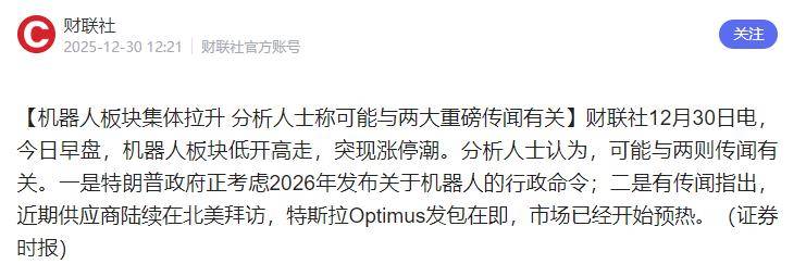 据证券时报报道,可能与两则传闻有关。一是特朗普政府正考虑2026年发布关于机器人的行政命令;二是有传闻指出,近期供应商陆续在北美拜访,特斯拉Optimus发包在即,市场已经开始预热。