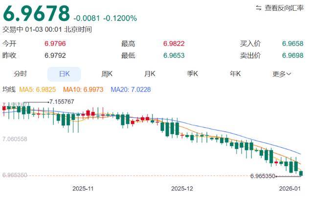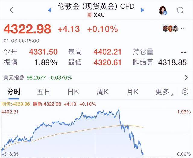 此外,人民币近期不断拉涨也是中国资产上涨的原因之一。截止1月3日,人民币汇率亦持续走强,离岸人民币兑美元汇率升破6.97,创2023年5月以来的新高水平。要知道,人民币汇率是由国际环境、资金流向、政策变化等多维因素共同作用的结果,其后续走势依然面临多重不确定性。贵金属方面,现货黄金冲破4400美元后突然掉头,有所回落,当前已几乎吐出当日全部涨幅;现货白银涨幅也大幅回撤。