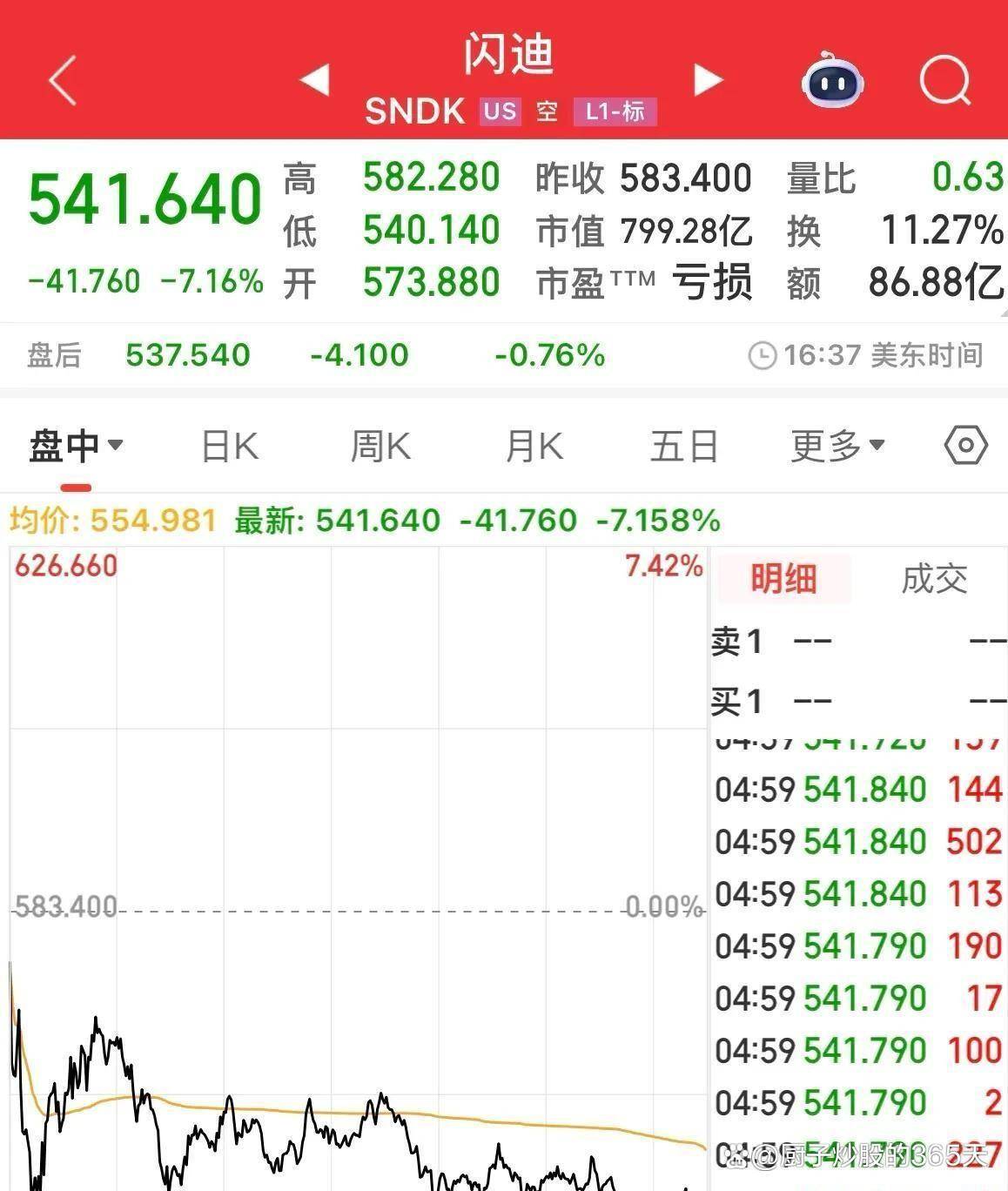 与AI软件股形成刺眼对比的,是存储芯片板块的集体崩塌。 以闪迪为例,该股在五天前刚刚创下725美元的高点,随后便开始了连续五个交易日的震荡回调,昨晚低开低走,最终跌幅锁定在7.16%。