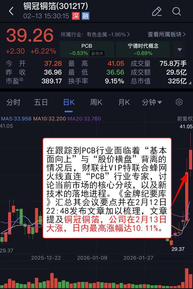 在跟踪到PCB行业面临着“基本面向上”与“股价横盘”背离的情况后,财联社VIP特联合蜂网火线直连“PCB”行业专家,讨论当前市场的核心分歧,以及新技术的落地进程。《金牌纪要库》汇总其会议要点并在2月12日22:48发布文章加以梳理,文章提及铜冠铜箔,公司在2月13日大涨,日内最高涨幅达10.11%。
