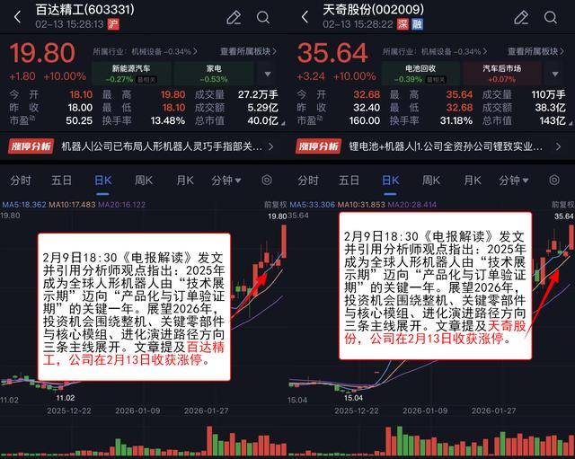 2月9日18:30《电报解读》发文并引用分析师观点指出:2025年成为全球人形机器人由“技术展示期”迈向“产品化与订单验证期”的关键一年。展望2026年,投资机会围绕整机、关键零部件与核心模组、进化演进路径方向三条主线展开。文章提及百达精工和天奇股份,两家公司均在2月13日收获涨停。