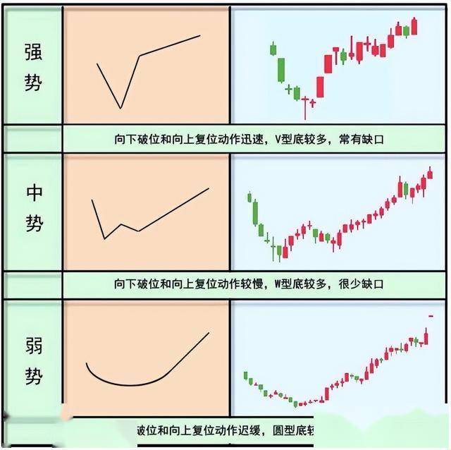 中势黄金坑的走法:股价向下破位和向上复位时动作较慢,W型较多,很少缺口。