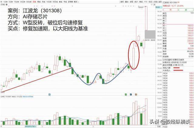 注意江波龙的形态分布,破位后走出反复筑底形态,然后股价缓慢修复至前高附近,最后走出倍量大阳线,确定主力意图,此时买点确立。