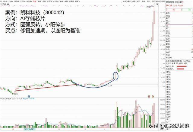 朗科科技因AI存储芯片的炒作而大涨,从黄金坑的角度理解,年初以来该股就处于形态构建中。先是下跌破位,然后构筑圆弧底,反弹初期以碎步连阳的结构,恢复上行趋势,临突破时,以倍量大阳线的方式,确立强度,此大阳线足以表明主力坐庄迹象,也是我们的买点。