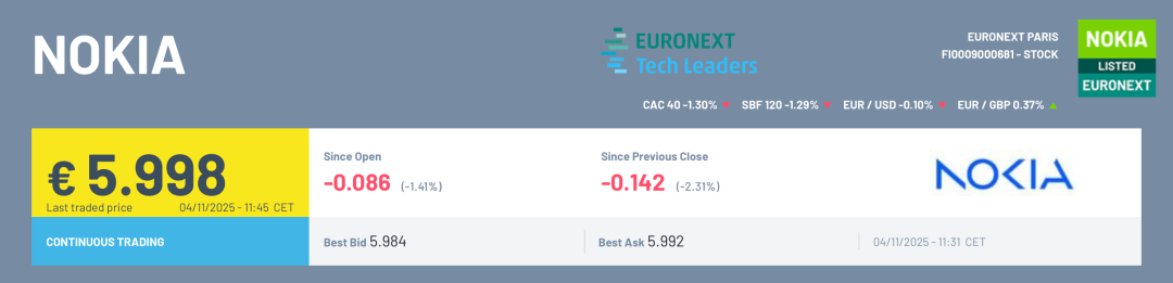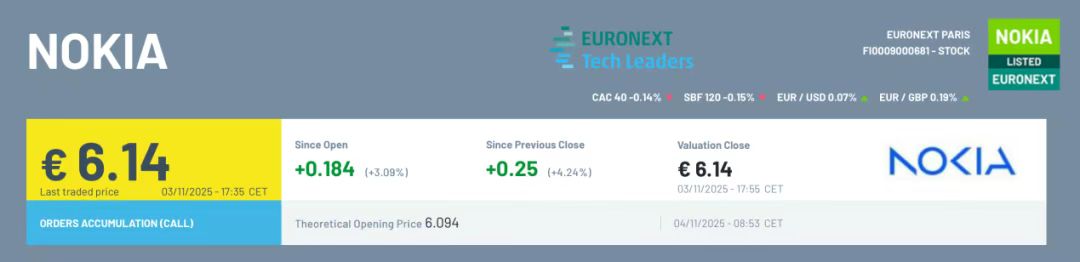 2025-11-05今日股市,股票推荐,大盘走势分析,股市资讯,股票入门,短线炒股/为广大股民提供及时准确的股市行情分析、热点股票推荐、最新利好政策解读与炒股实战经验,帮助你把握投资先机、实现财富增长!诺基亚表示,公司董事会已决定提交申请,将其股票(ISIN:FI0009000681)从巴黎泛欧证券交易所(Euronext Paris)摘牌。