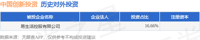 2025-11-20今日股市,股票推荐,大盘走势分析,股市资讯,股票入门,短线炒股/为广大股民提供及时准确的股市行情分析、热点股票推荐、最新利好政策解读与炒股实战经验,帮助你把握投资先机、实现财富增长!证券之星消息,根据天眼查APP显示,中国创新投资(01217.HK)新增一起对外投资事件,被投资公司为易生活控股有限公司,法定代表人,投资占比为16.66%。该公司从事,注册资本为。目前,中国创新投资共存在对外投资1项,详见下表: